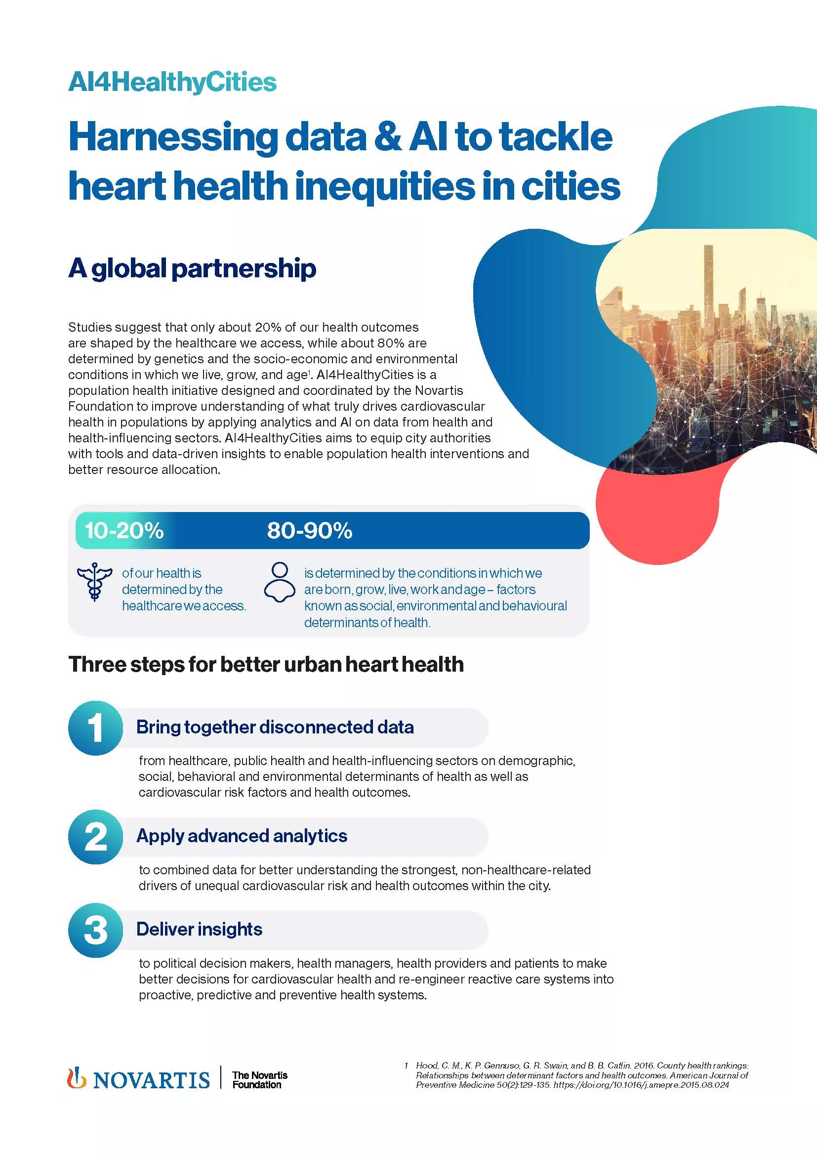 This document provides a more detailed overview of the Novartis Foundation’s AI4HealthyCities population health approach, both on a global scale and for the New York City program. It explains the science behind the approach, outlines city goals, mentions local partners in New York City, and offers potential patient personas as well as maps that visualize the distribution of social determinants of health potentially contributing to cardiovascular health across town. © 2024 The Novartis Foundation